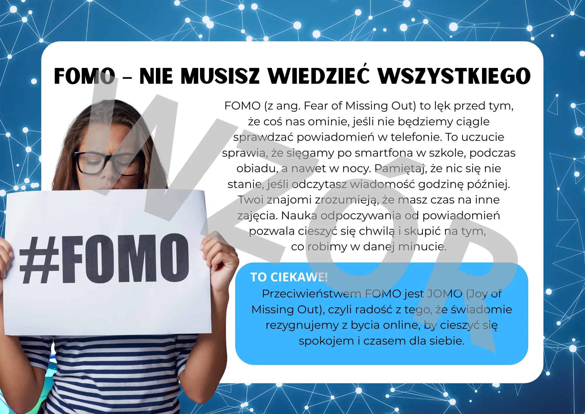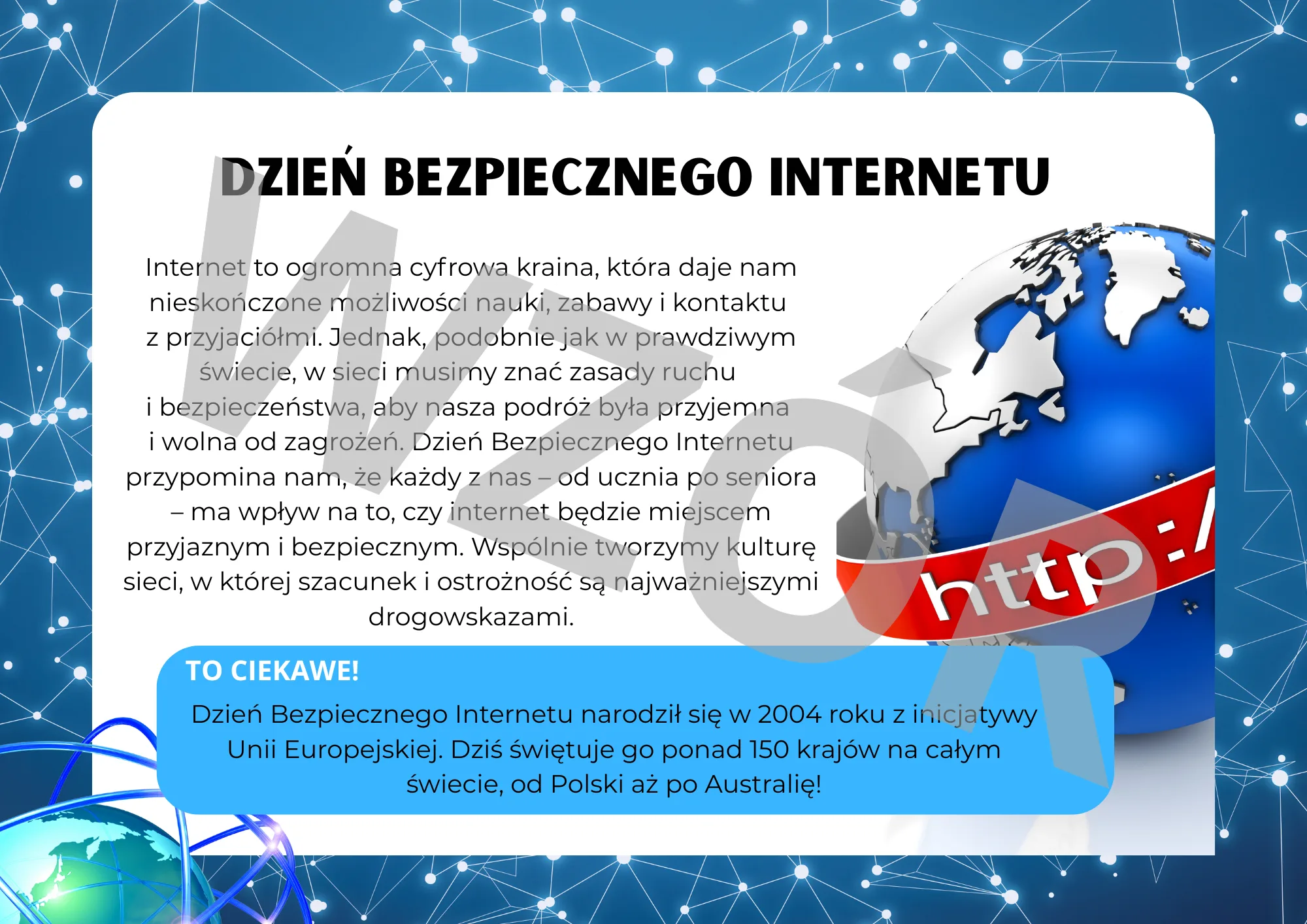 Zestaw „Bezpieczni w sieci – Dzień Bezpiecznego Internetu” to kompleksowa pomoc dydaktyczna składająca się z 15 plansz A4. Każdy arkusz został zaprojektowany tak, aby w nowoczesny, narracyjny sposób przekazać dzieciom i młodzieży kluczowe zasady poruszania się w świecie cyfrowym. Zamiast nudnych zakazów, oferujemy ciekawą opowieść o cyfrowym świecie, przeplataną zaskakującymi faktami w sekcji „Czy wiesz, że?”. Zestaw porusza najważniejsze aktualne tematy: od phishingu i hejtu, przez higienę cyfrową (FOMO), aż po prawa autorskie i ochronę wizerunku. Idealne na gazetkę szkolną, lekcje informatyki, godziny wychowawcze oraz do bibliotek.